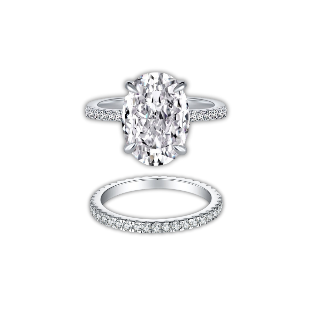 Celebrate love with the Forever Yours Ring Set of 2, crafted in genuine sterling silver and adorned with brilliant oval-cut CZ simulated diamonds. Featuring a dazzling 4 carat centerpiece, this timeless set offers the perfect diamond-dupe sparkle for engagements, anniversaries, or everyday elegance.