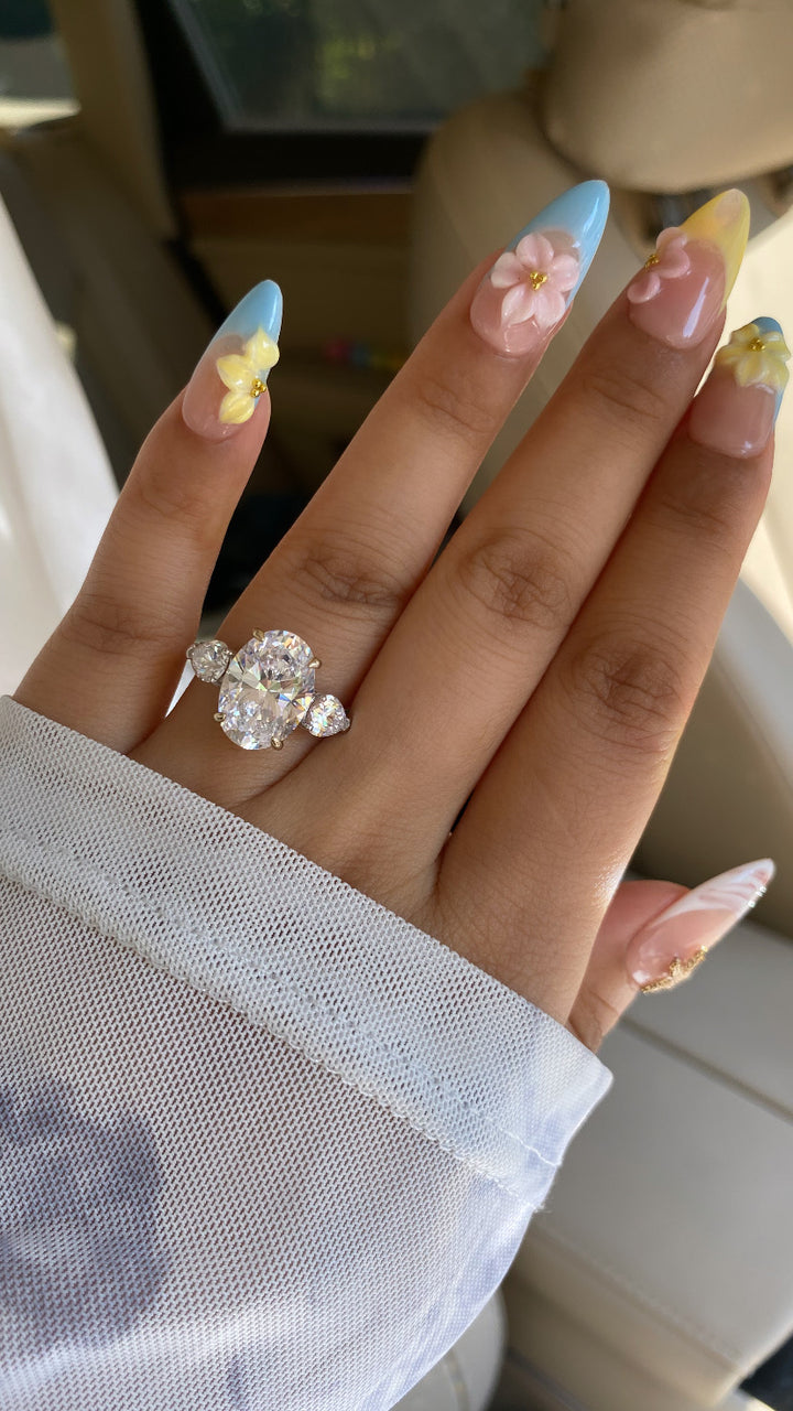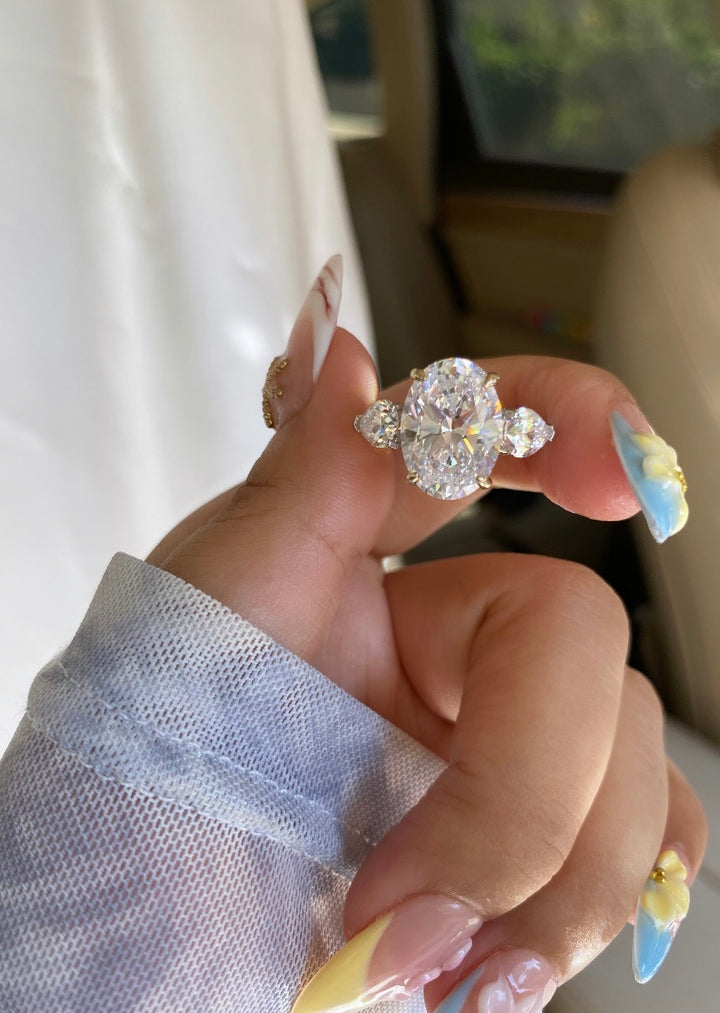 Royal Love Ring, a stunning oval-shaped 3-stone diamond ring crafted from genuine sterling silver. Designed to symbolize your past, present, and future, this timeless engagement ring features a brilliant oval-cut center stone flanked by two dazzling side stones, enhancing its elegance and sparkle.