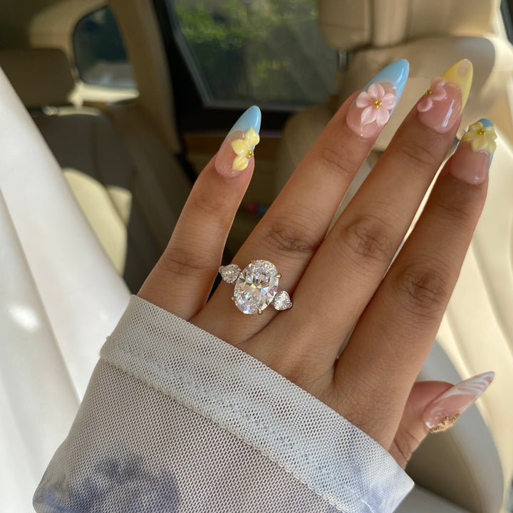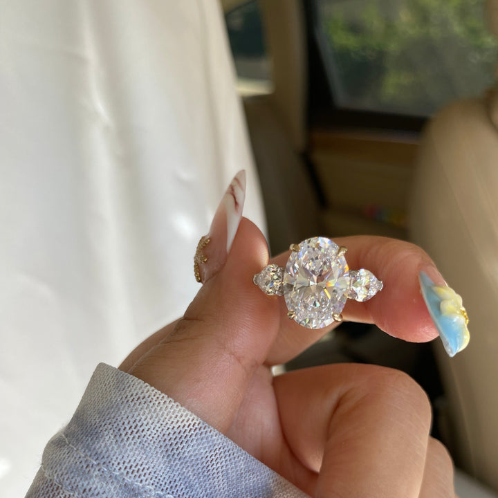 Royal Love Ring, a stunning oval-shaped 3-stone diamond ring crafted from genuine sterling silver. Designed to symbolize your past, present, and future, this timeless engagement ring features a brilliant oval-cut center stone flanked by two dazzling side stones, enhancing its elegance and sparkle.
